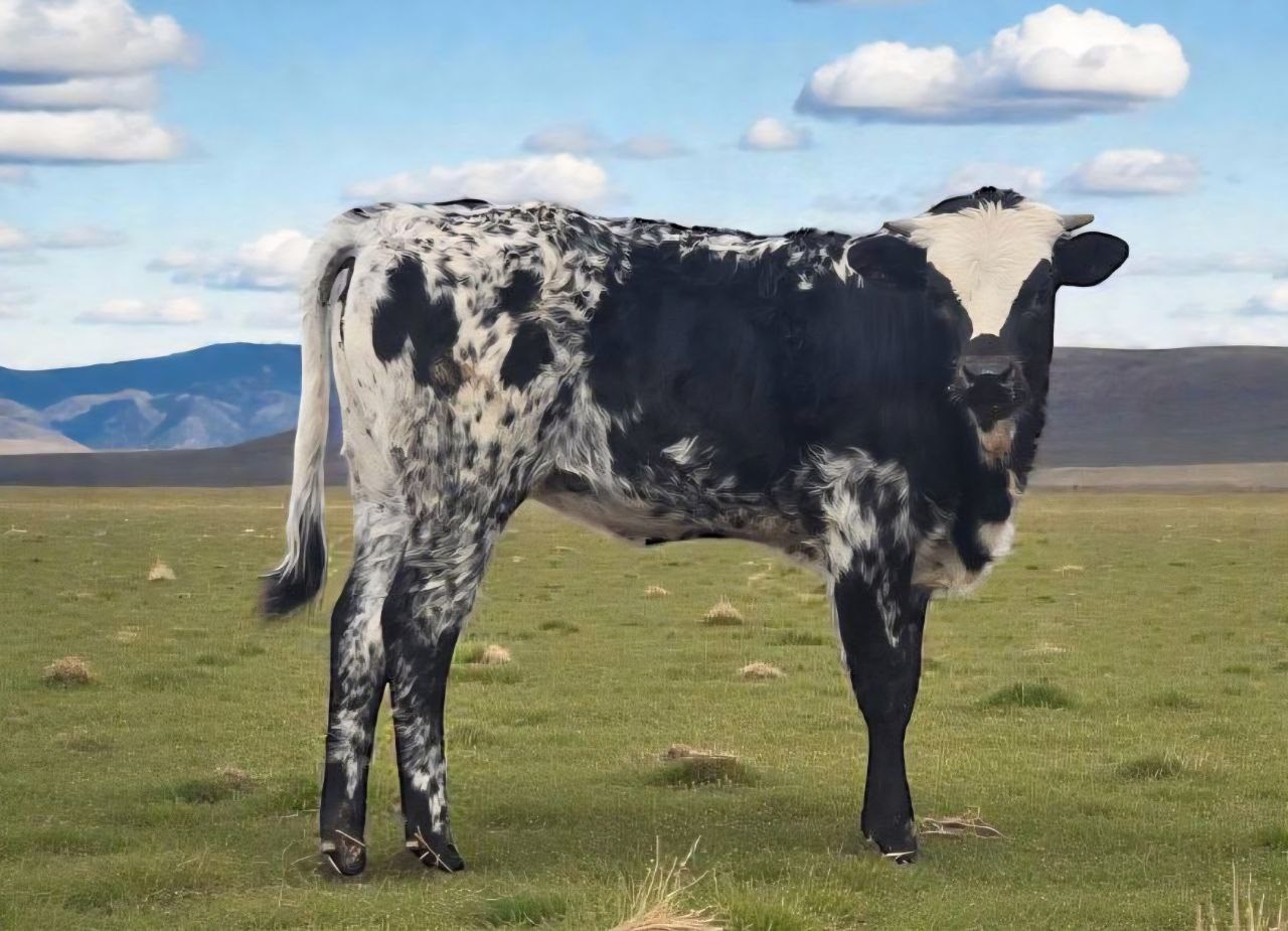 FLASHY black and white heifer out of our huge bodied WH Fine Iron and the late PCC Dark Spell who had just passed 85-1/2" TTT and was 59-1/2" tall at the hip before he unexpectedly died at 3-1/2 years of age... He was tall, smooth, and had an excellent temperament.